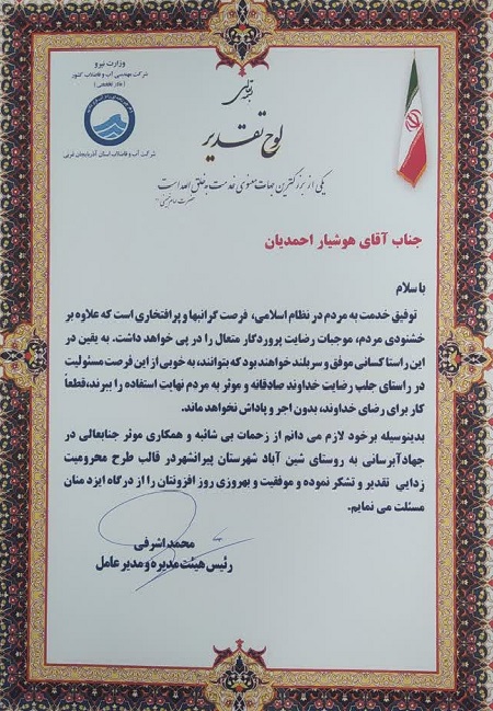 بدینوسیله بر خود لازم میدانم از زحمات بیشائبه و همکاری مؤثر جنابعالی در جهادآبرسانی به روستای شین آباد شهرستان پیرانشهر در قالب طرح محرومیت زدایی تقدیر و تشکر نموده و موفقیت و بهروزی افزونتان را از درگاه ایزد منان مسئلت مینمایم.