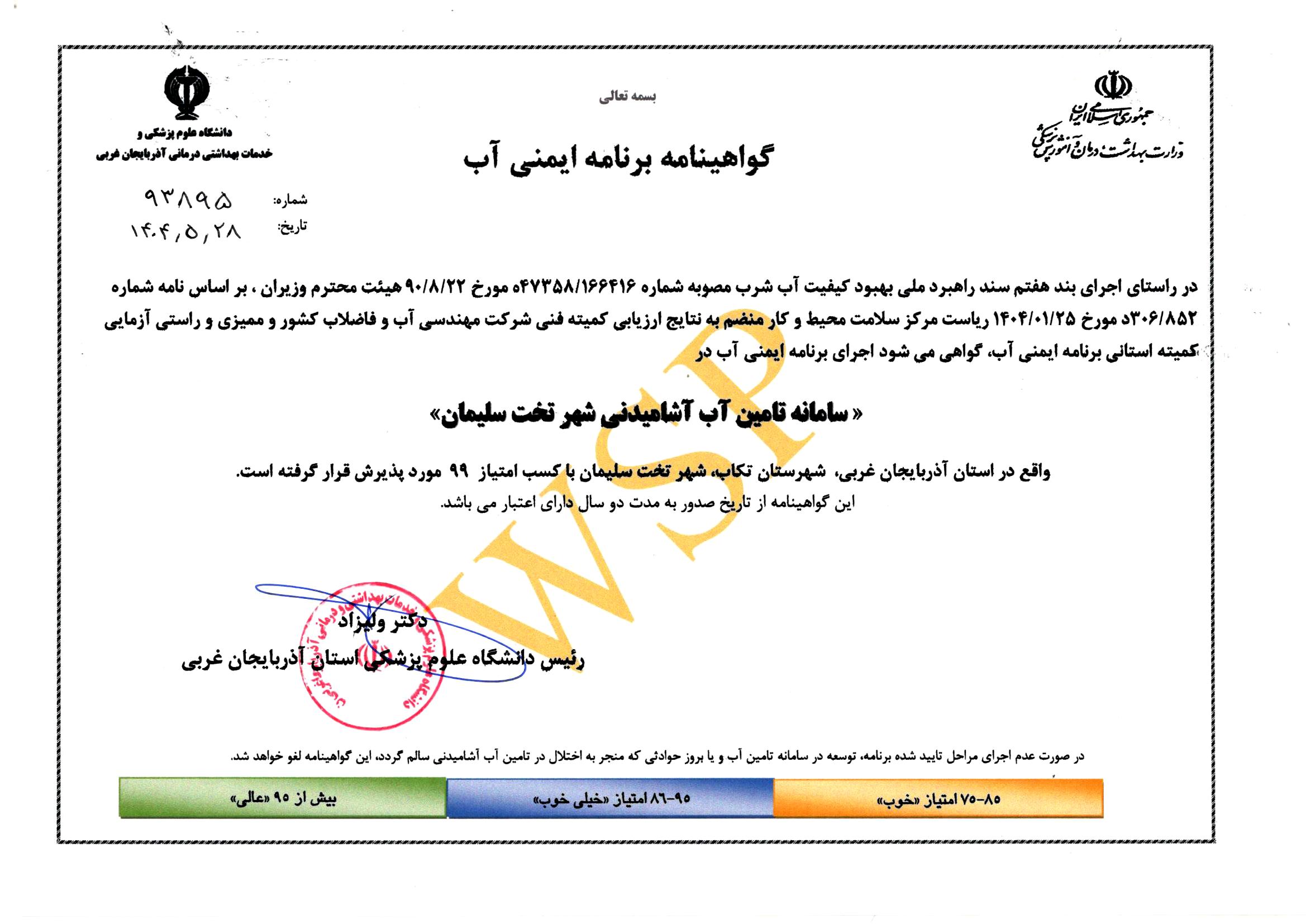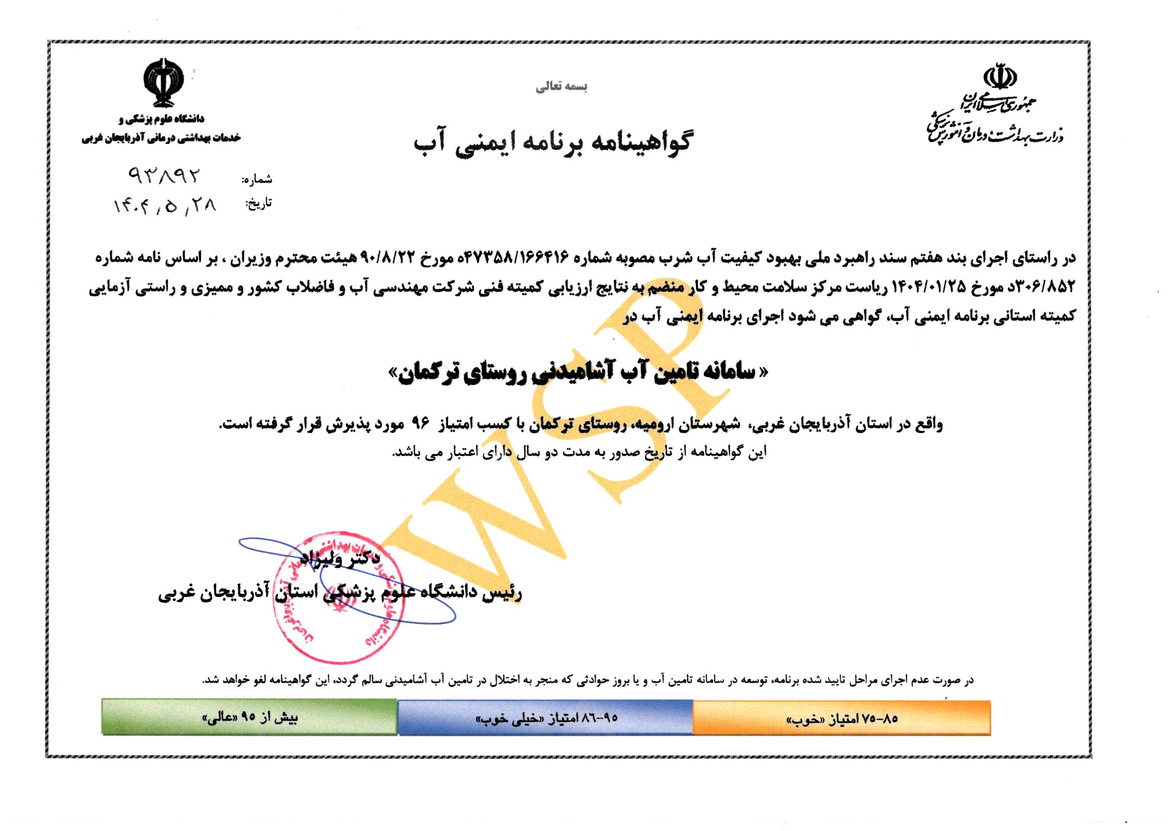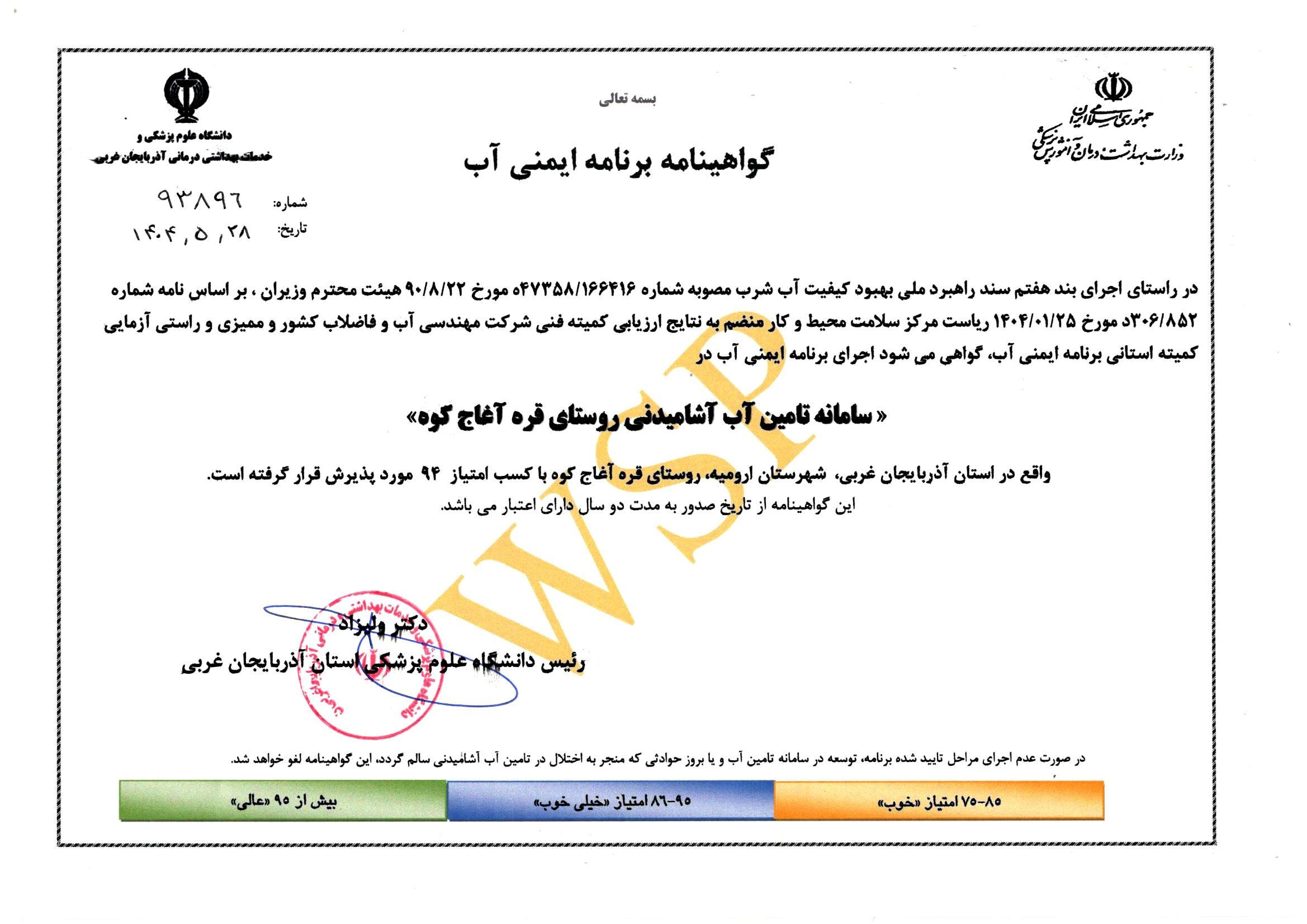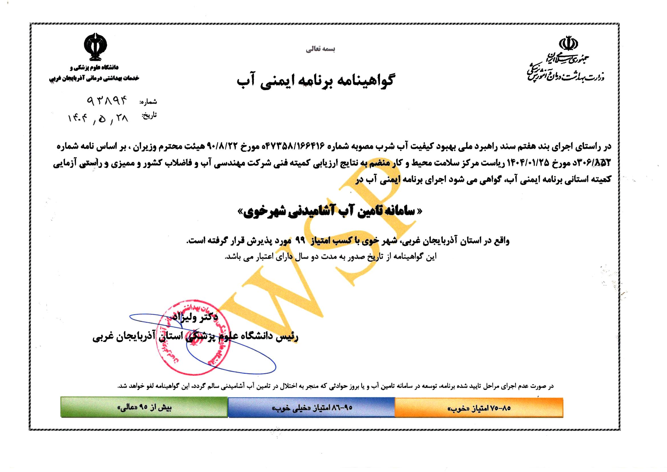 وی افزود: بر این اساس، شهرهای خوی و تختسلیمان تکاب و روستای قرهآغاجکوه موفق به اخذ گواهینامه ایمنی آب شدند و گواهینامه روستاهای ترکمان و شیخسرمست نیز تمدید گردید.