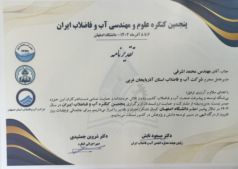 بدین وسیله از مشارکت و حمایت ارزشمندتان از برگزاری پنجمین کنگره آب و فاضلاب ایران در سال 1403 در تالار پیامبر اعظم دانشگاه اصفهان کمال تشکر، امتنان و تقدیر را ابراز می داریم.