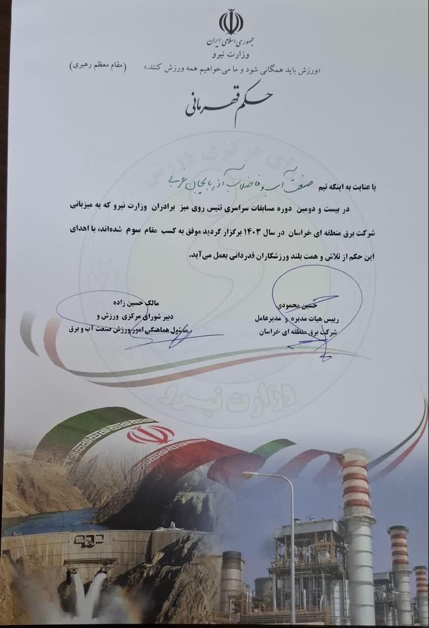 بیست و دومین دوره مسابقات تنیس روی میز وزارت نیرو که به صورت تیمی و انفردی برگزار شد، تیم آذربایجانغربی موفق به کسب رتبه سوم و بازیکنان این شرکت در مسابقات انفرادی رتبه های دوم و سوم این مسابقات را کسب کردند.