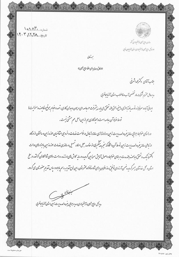 در راستای ضوابط اجرایی سامانه پنجره واحد مدیریت زمین و راه اندازی سامانه و تبادل در خواست خدمات و خروجی متقاضیان حوزه زمین و ساختمان از درگاه ارتباطی سامانه پنجره واحد مدیریت زمین توسط آن دستگاه که منجربه پیشگیری از مفاسد، جعل اسناد، تسهیل و ساماندهی خدمات حوزه زمین با ابزارهای دولت الکترونیک و تحق اهداف بلندمدت بر مبنای ضوابط و اصول آمایش سرزمین گردیده درسایه تلاشهای ارزنده و همت والای شما همکاران گرانقدر در سطح استان و محل خدمتتان میسر گردیده ضمن آرزوی توفیق روزافزون برای شما و خانواده محترمتان، این لوح تقدیر به رسم یادبود و سپاس تقدیم حضورتان می گردد.