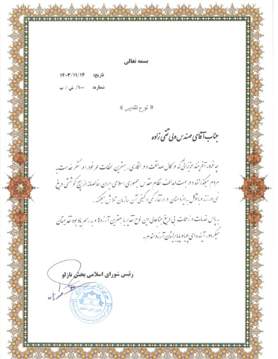 در متن لوح سپاس رئیس شورای اسلامی بخش نازلو خطاب به ولی تقیزاده، آمده است: