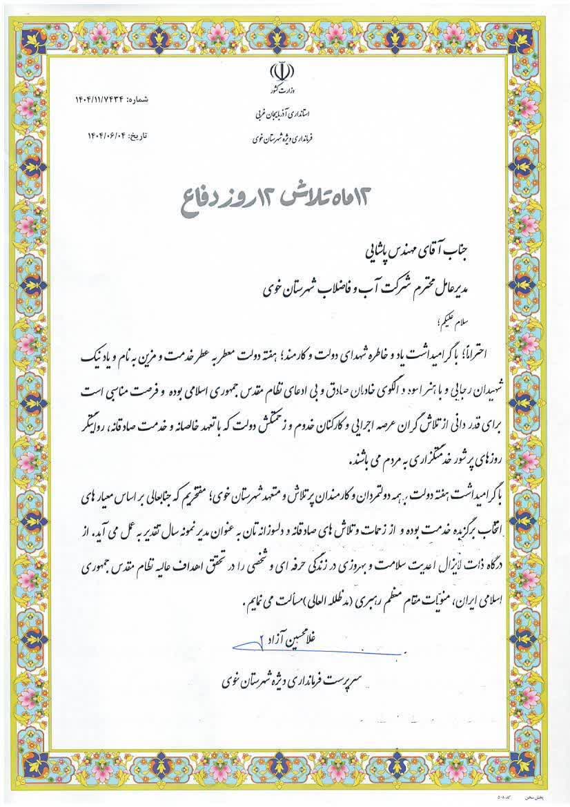 انتخاب پاشایی به عنوان مدیر نمونه شهرستان خوی نشاندهنده تعهد، پشتکار و مدیریت جهادی وی در پیشبرد اهداف شرکت آب و فاضلاب و خدمترسانی مطلوب به مردم شریف این شهرستان است.