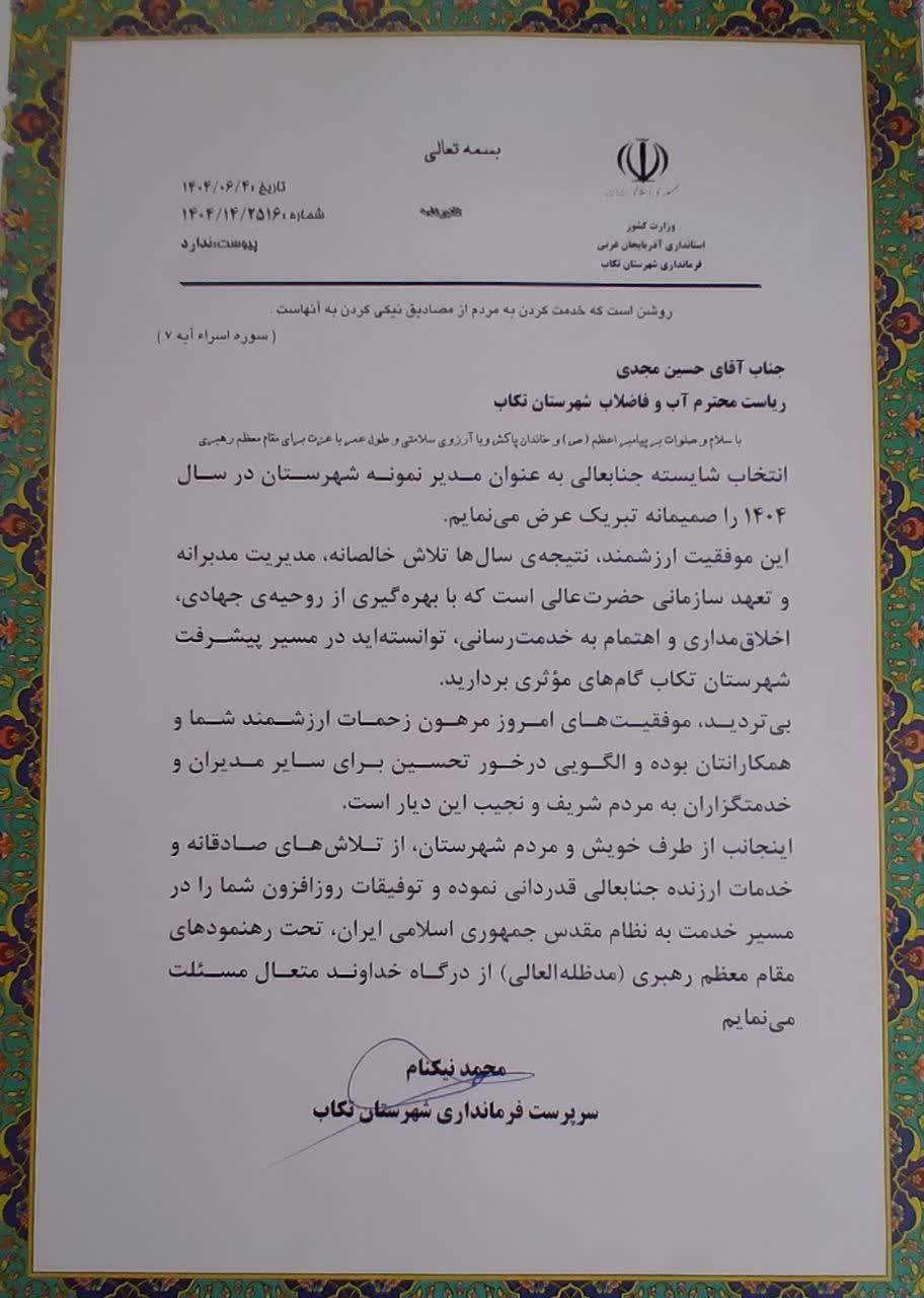 بیتردید موفقیتهای امروز مرهون زحمات ارزشمند شما و همکارانتان بوده و الگویی در خور تحسین برای سایر مدیران و خدمتگزاران به مردم شریف و نجیب این دیار است.