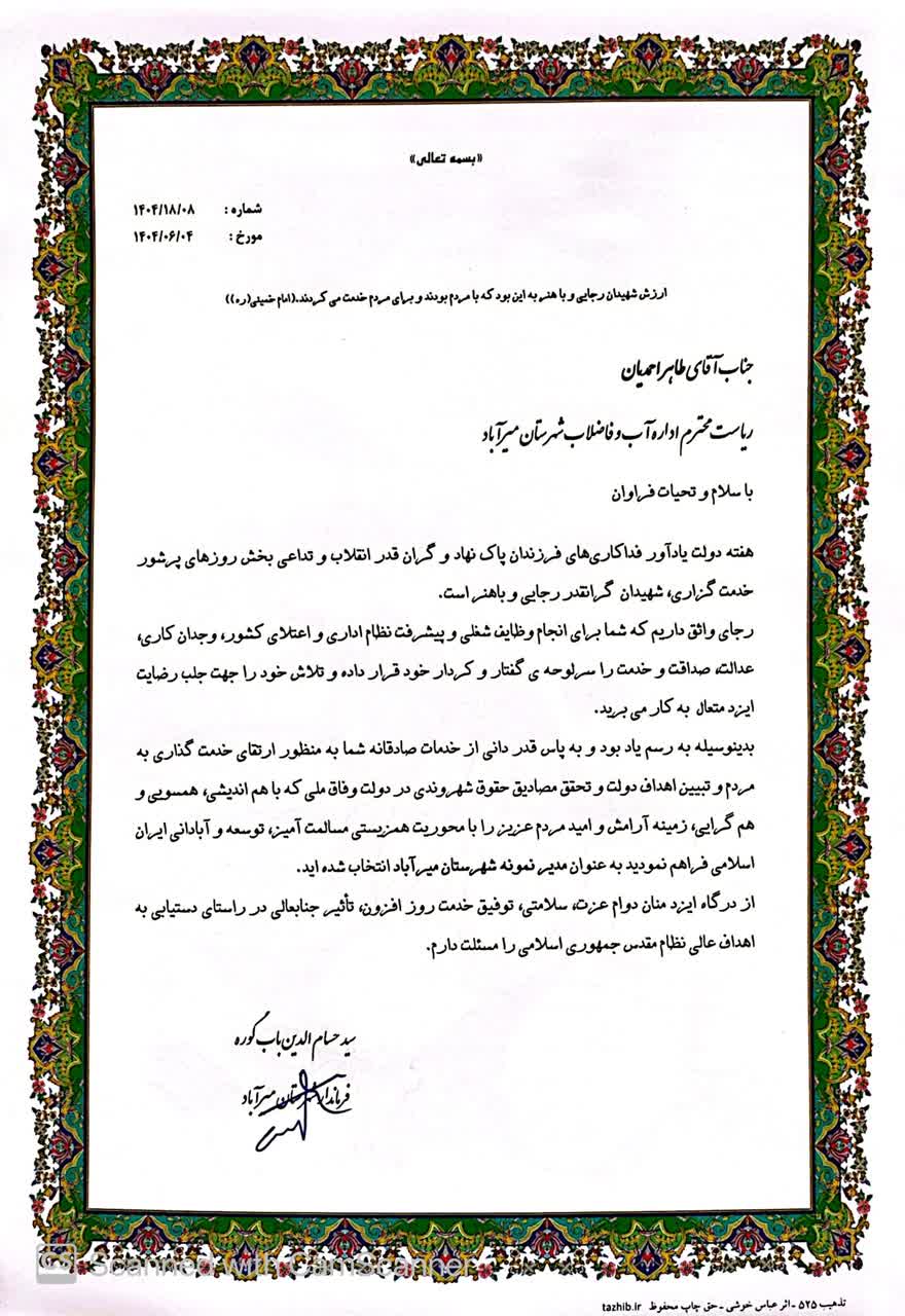 همزمان با گرامیداشت هفته دولت، مهندس طاهر احمدیان، رییس اداره آب و فاضلاب این شهرستان، از سوی فرمانداری به عنوان مدیر نمونه شهرستانی معرفی و مورد تجلیل قرار گرفت.
