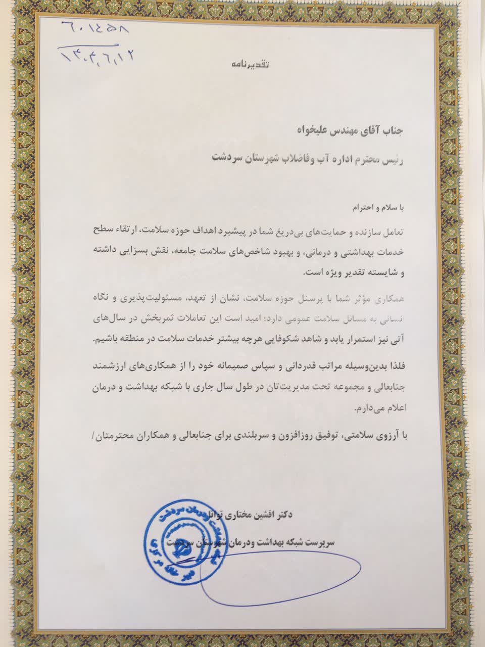 در مراسمی با حضور مسئولان شهرستان سردشت، سرپرست شبکه بهداشت و درمان این شهرستان با اهدای لوح تقدیر از خدمات و تلاشهای مهندس مهران علیخواه، مدیر امور آب و فاضلاب سردشت، قدردانی کرد.