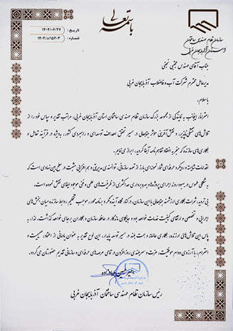 «احتراماً، اینجانب به نمایندگی از مجموعه بزرگ سازمان نظام مهندسی ساختمان استان آذربایجان غربی، مراتب تقدیر و سپاس خود را از تلاشهای خستگیناپذیر و نقشآفرینی مؤثر جنابعالی در سیر تحقق اهداف توسعهای و راهبردی کشور، بهویژه در فرآیند تعامل و همکاریهای سازنده که منجر به انعقاد تفاهمنامه آبفا گردید، ابراز میدارم.