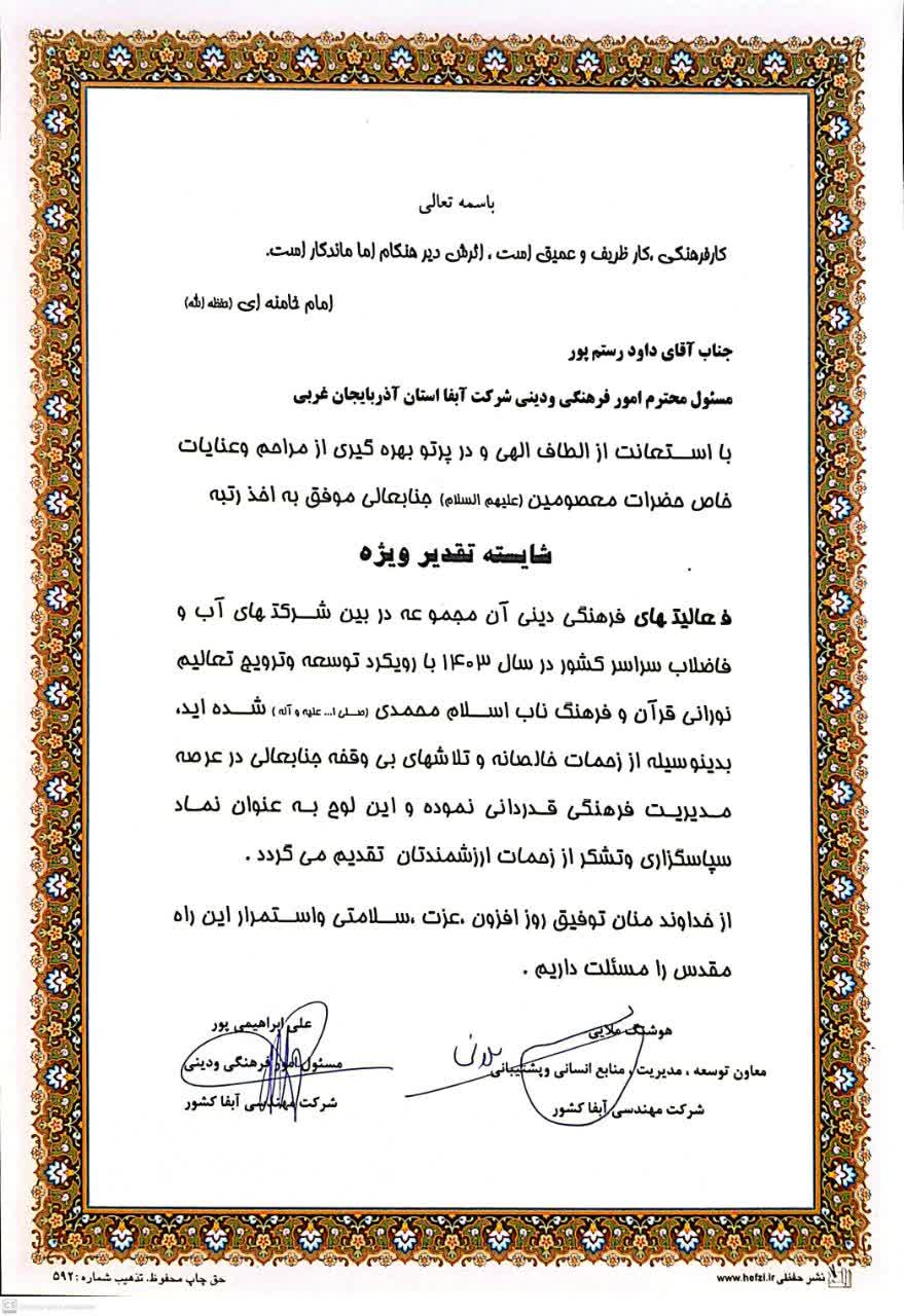 در پایان این همایش با اهدای لوح از داود رستمپور مسئول امور فرهنگی و دینی شرکت آب و فاضلاب آذربایجان غربی به عنوان مدیر فرهنگی برتر تقدیر شد.