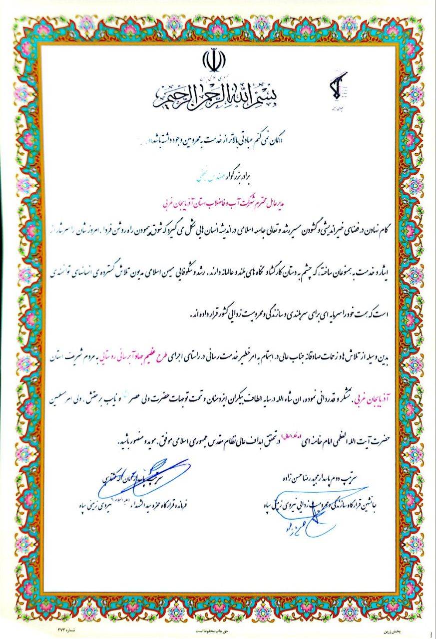 بدینوسیله از تلاشها و زحمات صادقانه جنابعالی در اهتمام به امر خطیر خدمترسانی در راستای اجرای طرح جهادی آبرسانی روستایی به مردم شریف استان آذربایجانغربی تقدیر و تشکر میگردد. انشاءالله در سایه الطاف بیکران ایزد منان و تحت توجهات حضرت ولیعصر(عج) و نایب بر حق ایشان، مقام معظم رهبری حضرت آیتالله العظمی امام خامنهای (مدظلهالعالی)، در تحقق اهداف نظام مقدس جمهوری اسلامی موفق و منصور باشید.»