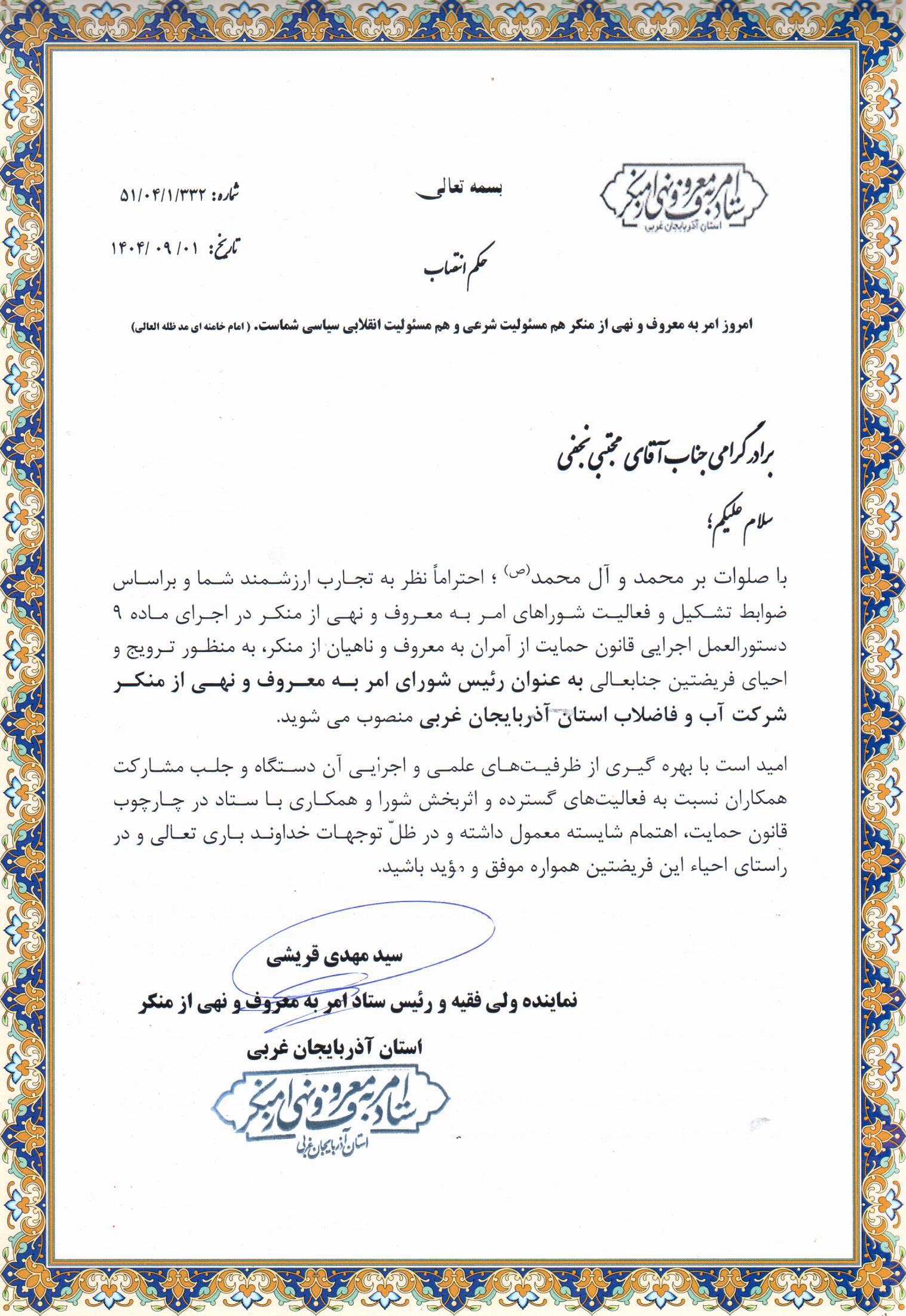 با صلوات بر محمد و آل محمد (ص)؛ احتراماً نظر به تجارب ارزشمند شما و بر اساس ضوابط تشکیل و فعالیت شوراهای امر به معروف و نهی از منکر در اجرای ماده ۹ دستورالعمل اجرایی قانون حمایت از آمران به معروف و ناهیان از منکر، به منظور ترویج و احیای فریضتین جنابعالی به عنوان رئیس شورای امر به معروف و نهی از منکر شرکت آب و فاضلاب استان آذربایجان غربی منصوب میشوید.